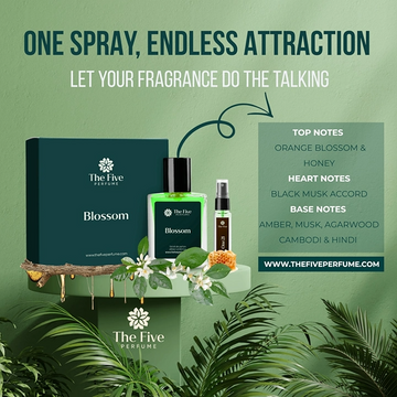 TheFivePerfume – Blossom"One spray, endless attraction—let your fragrance do the talking."Step into a world of sensual elegance with Blossom, a captivating unisex fragrance from TheFivePerfume. It opens with the luminous sweetness of orange blossom and honey, inviting you in with warmth and golden charm. At its